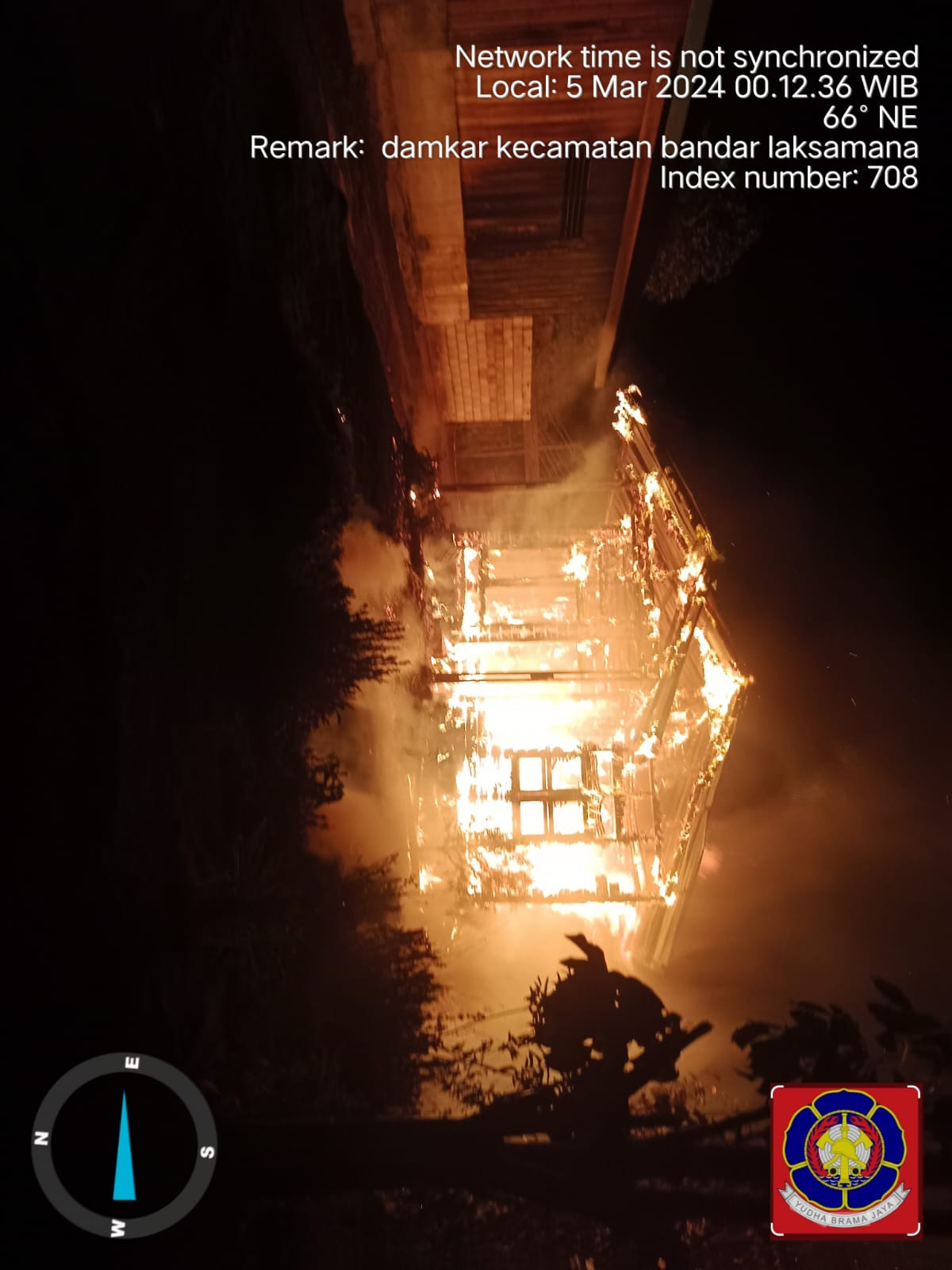 Bengkalis - Pos Damkar Kecamatan Bandar Laksamana berhasil memadamkan kebakaran yang melahap sebuah rumah bulatan permanen ukuran 16x15 m dan 3 unit sepada motor (Zainudin 72 tahun ) yang beralamat di jalan Jend Sudirman R 01t/Rw 01 Desa Sepahat, Kecamatan Bandar Laksamana Kabupaten Bengkalis, Selasa (5/3/24).