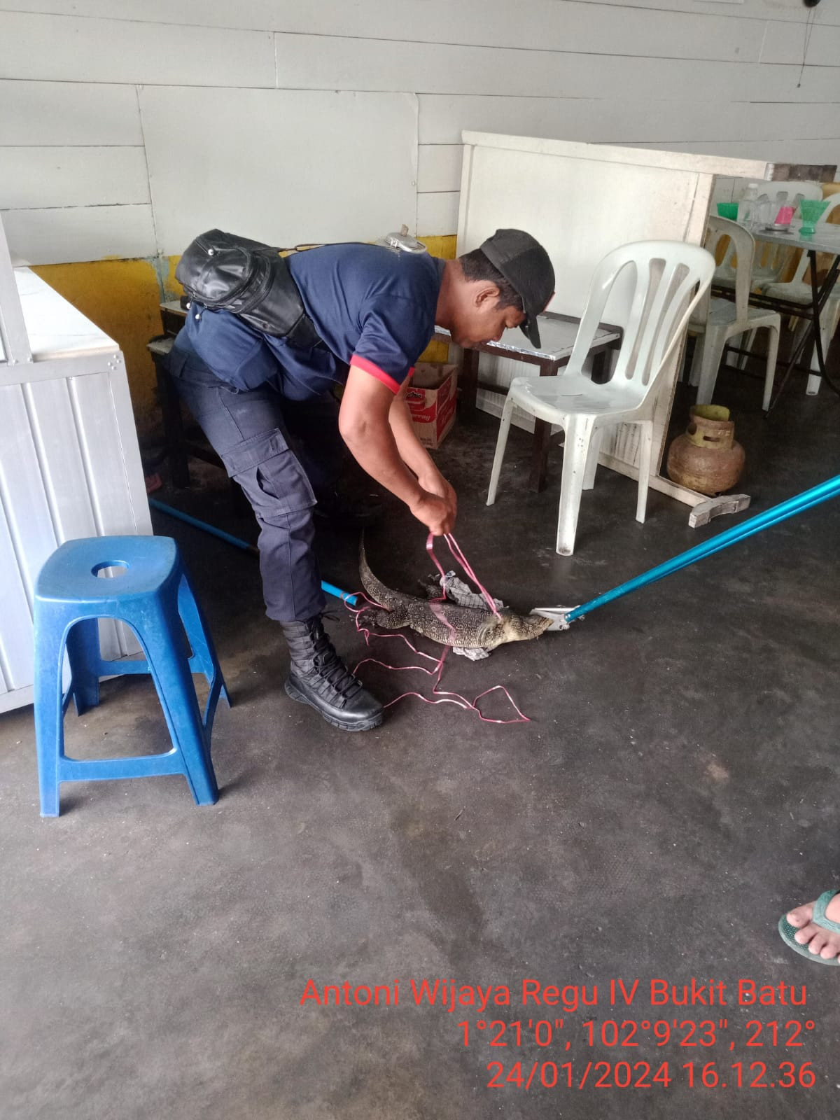 Bengkalis - Petugas Dinas Pemadam Kebakaran (Damkar) Upt Damkar Kecamatan Bukit Batu mengevakuasi satu ekor biawak yang Masuk dikedai Kopi di jalan Jendral Sudirman Kelurahan Sei Selari Kecamatan Bukit Batu, Kabupaten Bengkalis (24//1/24).