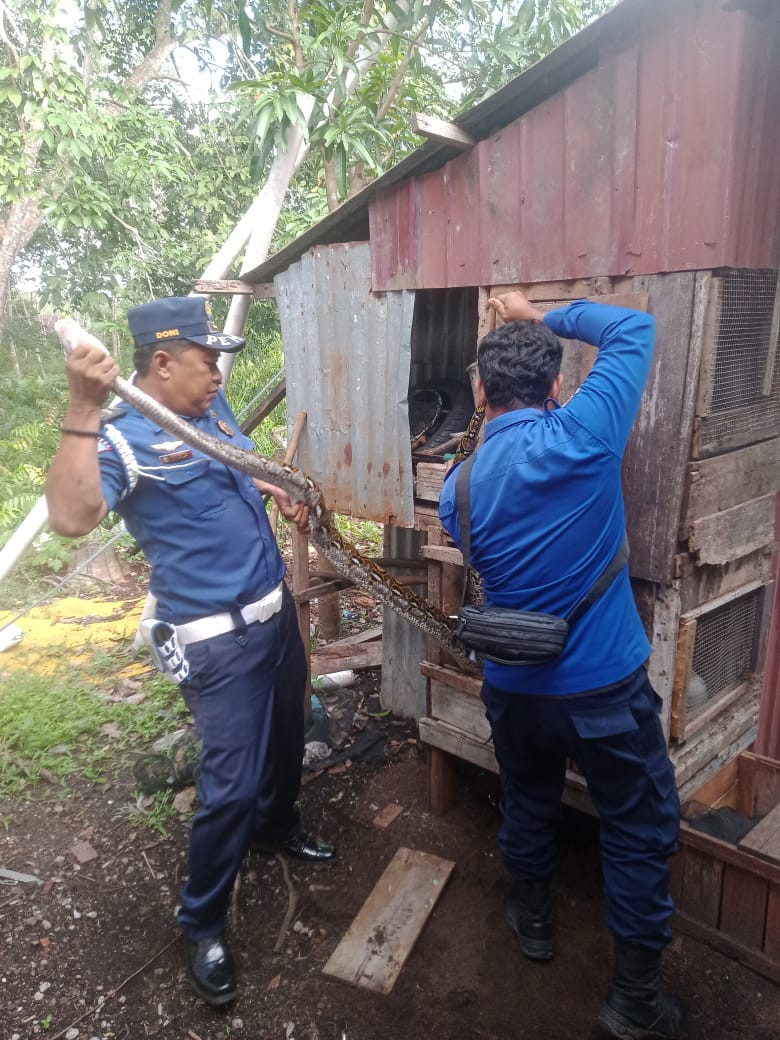 Bengkalis - Petugas Dinas Pemadam Kebakaran (Damkar) mengevakuasi satu ekor ular sawa di perkarangan warga yang masuk kandang ayam di jalan Asalam Gg Ikwan (Pelapor Nasan) Kelurahan Desa Kelapapati Kecamatan Bengkalis (29/1/24).