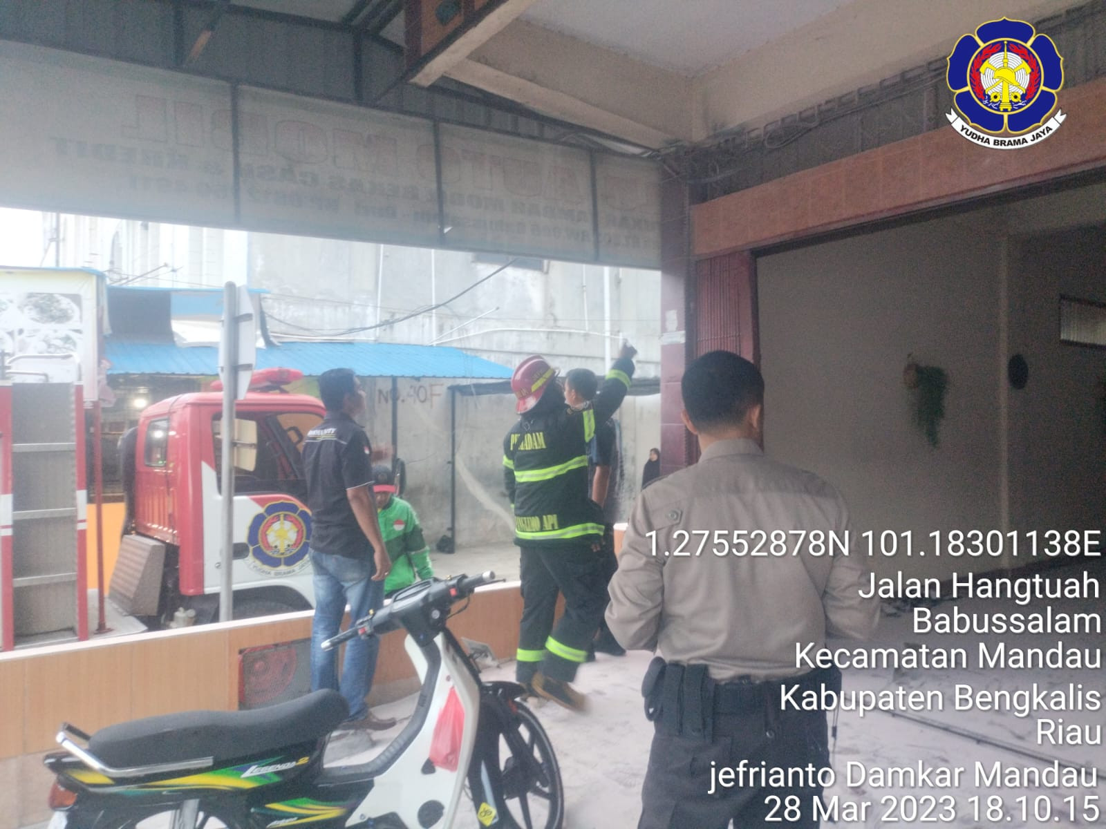 Bengkalis, UPT Damkar Kecamatan Mandau melakukan evakuasi kabel internet yang terbakar (28/03/23) jalan Hangtuah, Kelurahan Babussalam, Kecamatan Mandau, Kabupaten Bengkalis. Tim yang tutun dalam kejadian tersebut Danru jefrianto, Anggota regu 01.