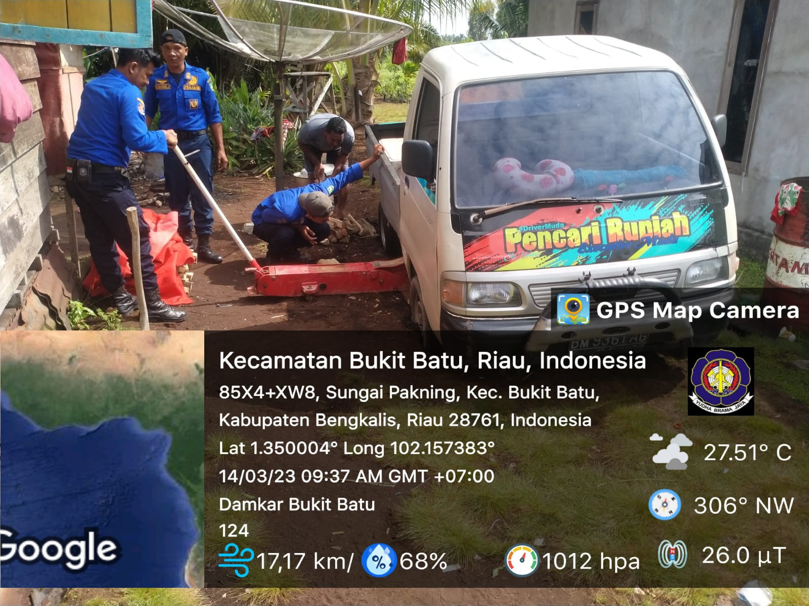 Bengkalis, UPT Damkar Kecamatan Bukit Batu mengevakuasi mobil terpuruk (14/03/2023) Pukul 09:30 wib di jalan Sukajadi rt 006/rw004, Kelurahan Desa Pakning asal Kecamatan Bukit Batu. Petugas damkar yang telah menerima laporan langsung melakukan evakuasi dan tim yang turun dalam kejadian tersebut Anggota regu 2.