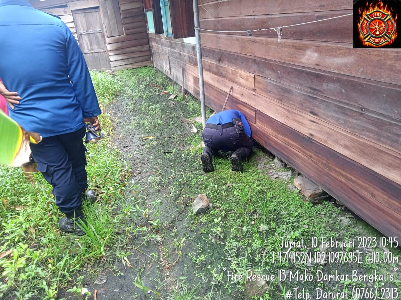 Jum'at (10/02/2023) Pukul 11.58 Wib, Pos Damkar Bengkalis mengevakuasi Ular Di Kolong Rumah di Jalan Warga Ponegoro Kelurahan Bengkalis Kota, (Pelapor Ayan) Kecamatan Bengkalis. Petugas Damkar yang telah menerima laporan langsung melakukan evakuasi, tim yang turun dalam kejadian Fire & Rescue Regu 04 Bengkalis.
