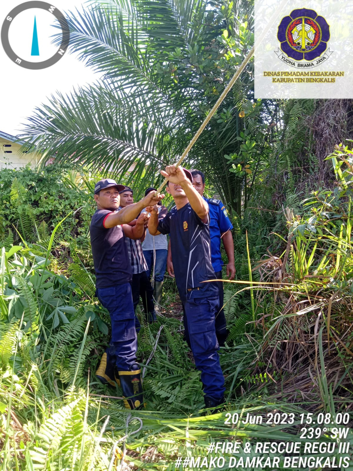 Bengkalis, Mako Damkar Bengkalis melakukan eksekusi pohon kelapa yang condong ke arah rumah warga (20/06/23) di jalan Bantan, Desa, Senggoro, Kecamatan Bengkalis. Tim yang turun dalam kejadian tersebut Anggota damkar regu 03, Mako Damkar Bengkalis.