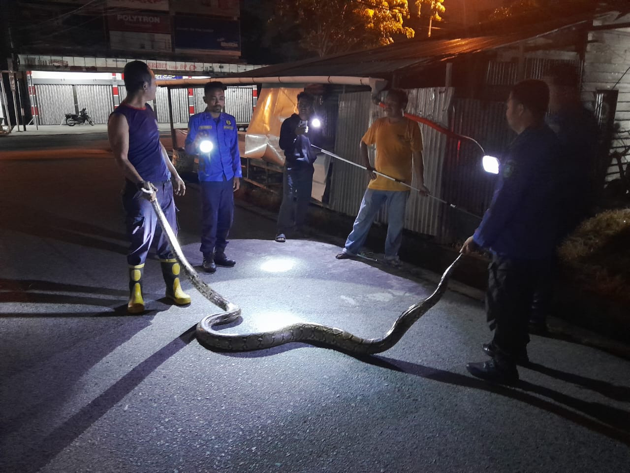 Bengkalis, Mako Damkar Bengkalis evakuasi ular sawa (06/4/23) pukul 02.35 wib dijalan Rumbia Desa lurah kota. Tim yang turun dalam kejadian tersebut Fire & Rescue Regu 01 Bengkalis.