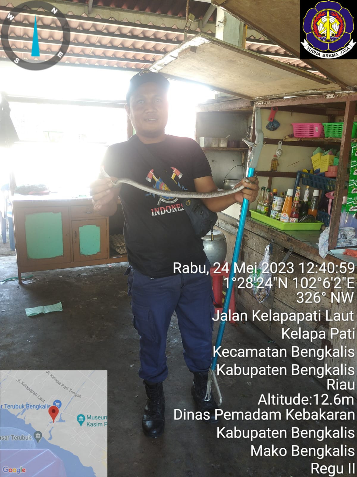 Bengkalis, MAKO Damkar Bengkalis Kecamatan Bengkalis melakukan Evakuasi Ular Sawa (24/05/23) pukul 12.40 Wib, jalan Kelapapati Laut Desa Kelapapati Kecamatan Bengkalis.Tim yang turun dalam kejadian tersebut Petugas Damkar Regu 02 Pos Kecamatan Bengkalis.