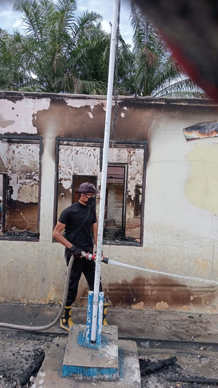 Begkalis, Giat Anggota UPT Damkar Mandau membersihkan lokasi pos polisi simpang Bangko yang terbakar kemarin komandan.