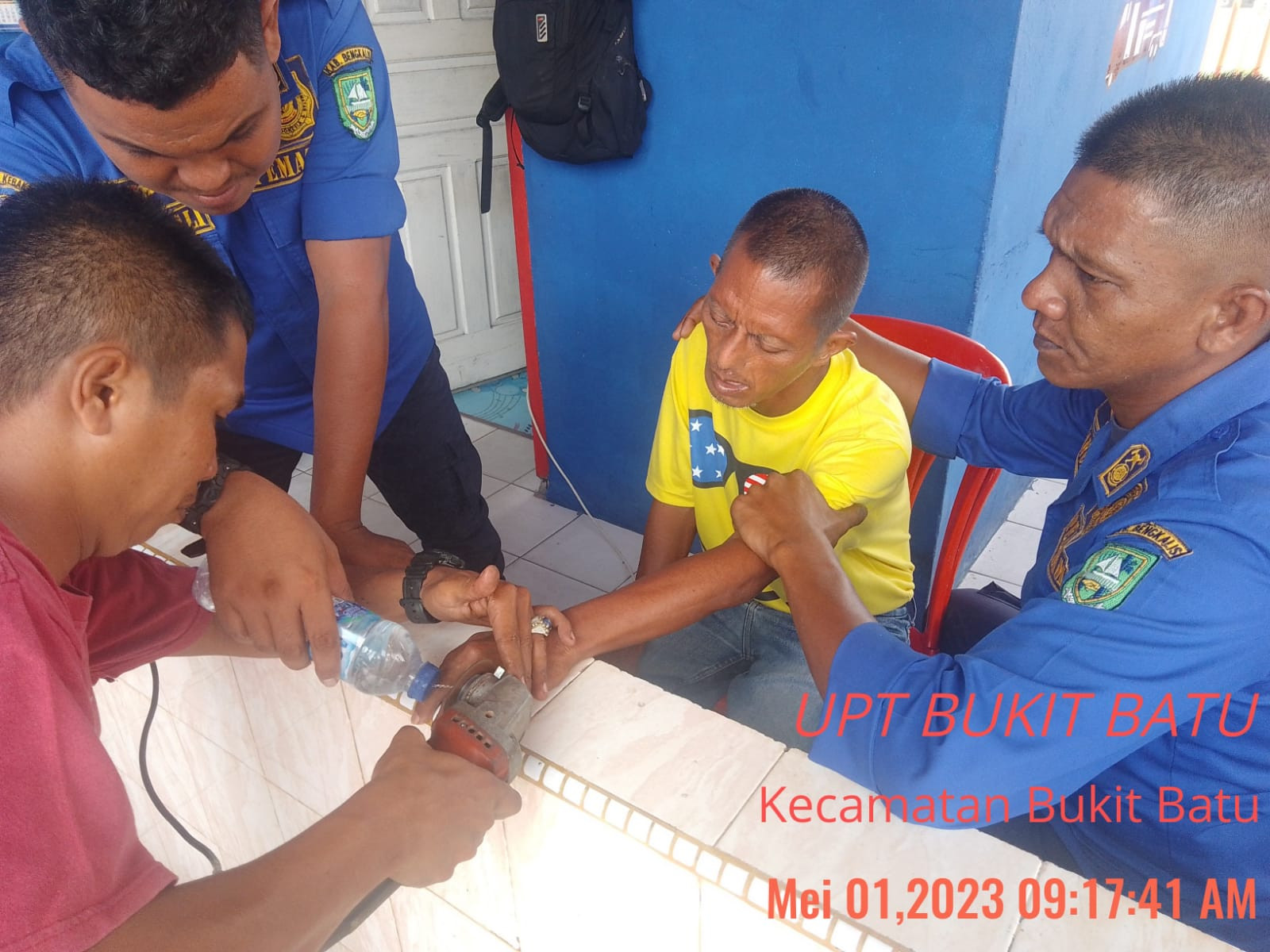 Bengkalis, Giat anggota UPT Damkar Kecamatan Bukit Batu melakukan pemotongan cincin di jari (01/05/23). Pukul 09:20 Wib. Tim yang melakukan evakuasi Anggota regu 02.
