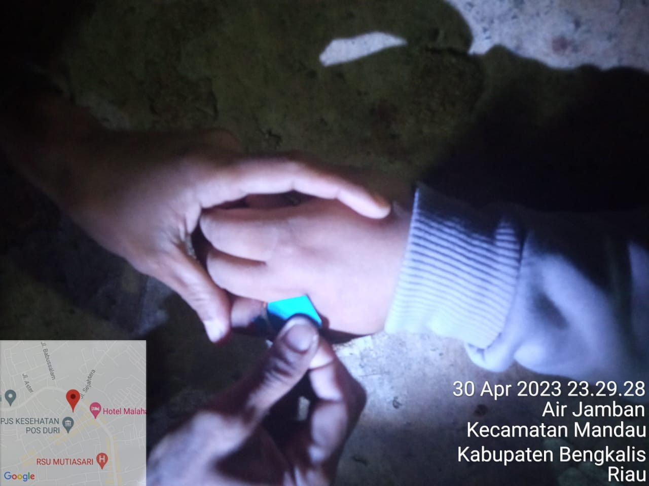 Bengkalis, Giat anggota UPT Damkar Kecamatan Mandau melakukan pemotongan cincin di jari manis (30/04/23). Pukul 23:10 wib di Lintas, Duri Dumai km 7 kulim, Desa Balai Makam , Kecamatan Bathin solapan Kabupaten Bengkalis. Tim yang melakukan evakuasi Ketua regu Yudi, Tim yang Turun Anggota Regu 02.