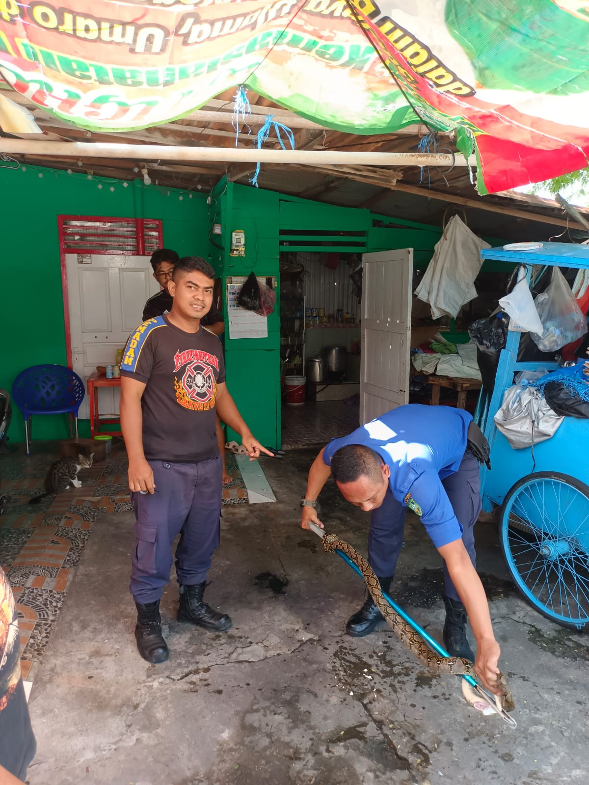 Bengkalis, Mako Damkar Bengkalis Kecamatan Bengkalis melakukan evakuasi Ular sawa (08/07/23) pukul 10:50 Wib di jalan Jnd Sudirman Gg.Melur, kelurahan kota Kecamatan Bengkalis.Tim yang turun dalam kejadian tersebut Fire & Rescue Regu 01 Bengkalis.