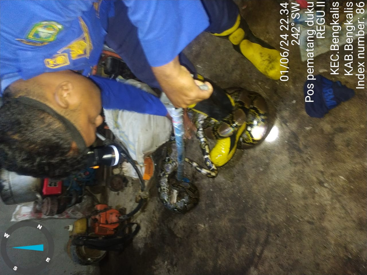 Bengkalis - Giat Pos Damkar Pematang Duku mengevakuasi ular sawa masuk rumah warga di Jalan Utama Sungai Batang (Pelapo Riduan) Desa/Kelurahan Desa Sungai Batang Kecamatan Bengkalis, Sabtu (1/6/24).