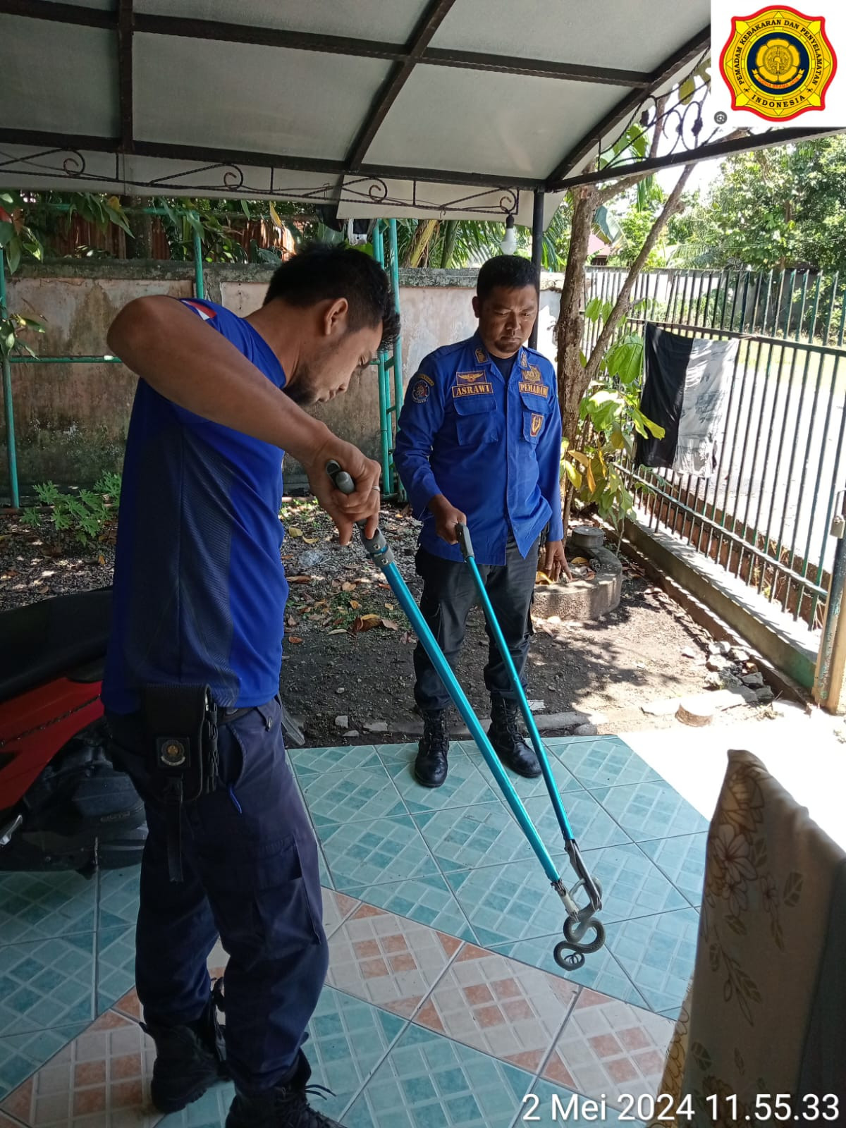 Bengkalis - Petugas MAKO Damkar Bengkalis Kecamatan Bengkalis mengevakuasi ular (Daun) pukul 12:18 Wib yang beralamat di jalan Senayan Kelurahan Damon Kecamatan Bengkalis, Kamis (2/5/24).