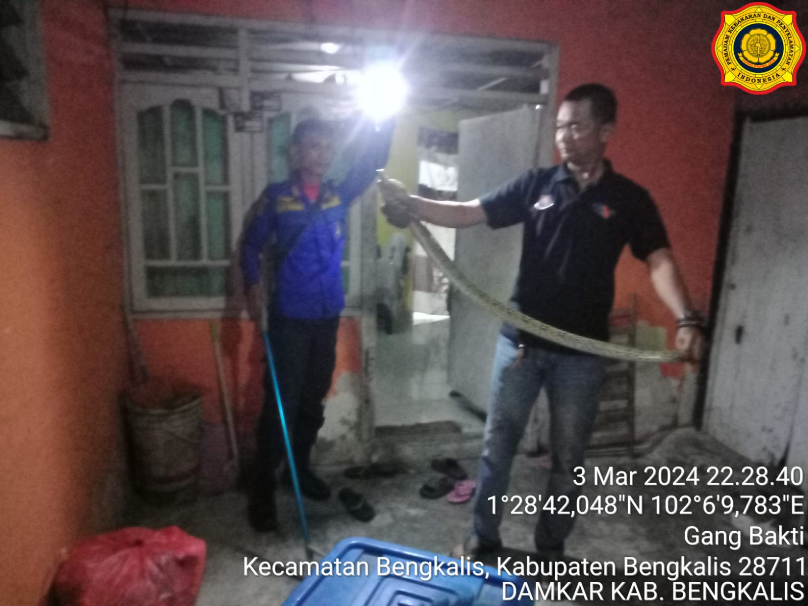 Bengkalis - Mako Damkar Bengkalis mengevakuasi ular (Sawa) pukul 22.07 Wib (3/3/24) yang beralamat di jalan Gang Keluarga Kelapapati Tengah (Pelapor Dayat) Desa / Kelurahan Kelapapati, Kecamatan Bengkalis. Tim yang turun dalam kejadian tersebut Fire & Rescue Regu 04 Bengkalis.