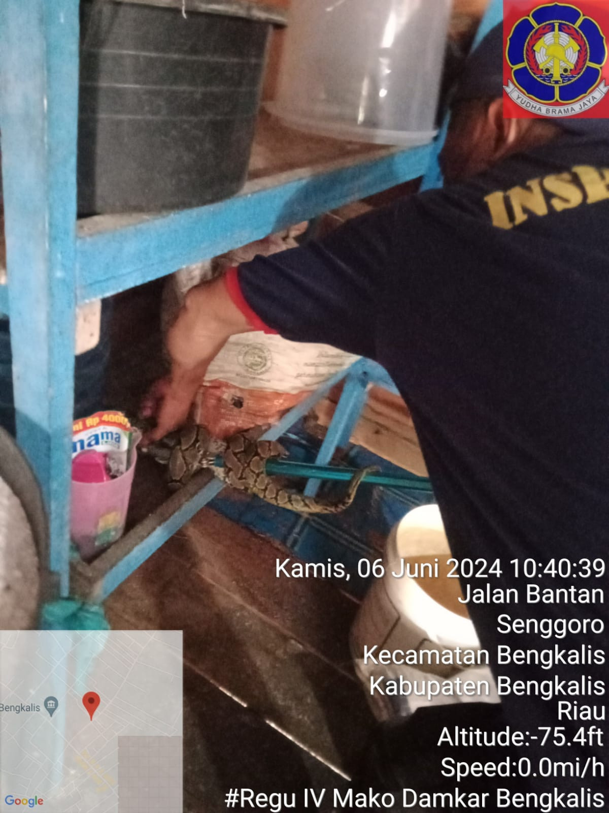 Bengkalis - MAKO Damkar Bengkalis menerima laporan dari warga adanya ular masuk dalam perkarangan warga (Pelapor Amrullah) yang beralamat di jalan Bantan Desa Senggoro Kecamatan Bengkalis, Kamis (6/6/24).