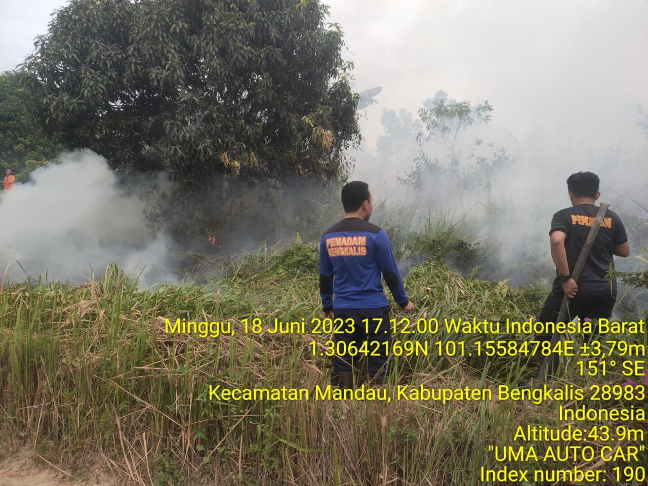 Bengkalis,Telah terjadi kebakaran lahan dan hutan (karhutla) pukul 16:49 Wib (18/06/23) di jalan Pipa Air Bersih, Rt 04/Rw 05, Desa Simpang Padang, Kecamatan Bathin Solapan. Penyebab kebakaran belum diketahui pasti namun luas wilayah hutan dan lahan yang terdampak diperkirakan sekitar -/+ 05 ha dan api berhasil di padamkan pukul 17:25 Wib. Tim yang turun dalam kejadian tersebut Anggota damkar regu 02, BPBD Bathin Solapan.