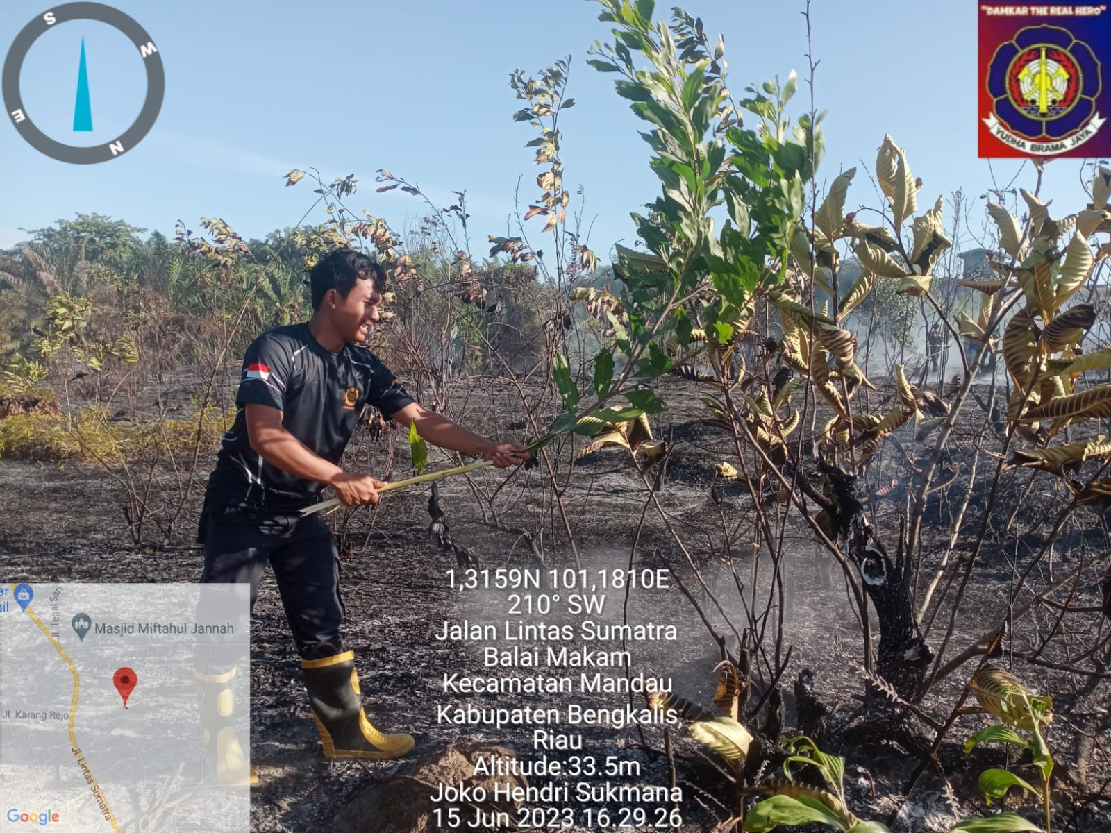 Bengkalis,Telah terjadi kebakaran lahan dan hutan (karhutla) pukul 15:10 Wib (15/06/23) di jalan Hasanuddin km 3,5 kulim, Rt 01/Rw 04, Desa Pematang Obo, Kecamatan Bathin Solapan. Penyebab kebakaran belum diketahui pasti namun luas wilayah hutan dan lahan yang terdampak diperkirakan sekitar -/+ 05 ha dan api berhasil di padamkan pukul 16: 37 Wib. Tim yang turun dalam kejadian tersebut Anggota damkar regu 01, BPBD Bathin Solapan dan Anggota Polsek mandau.