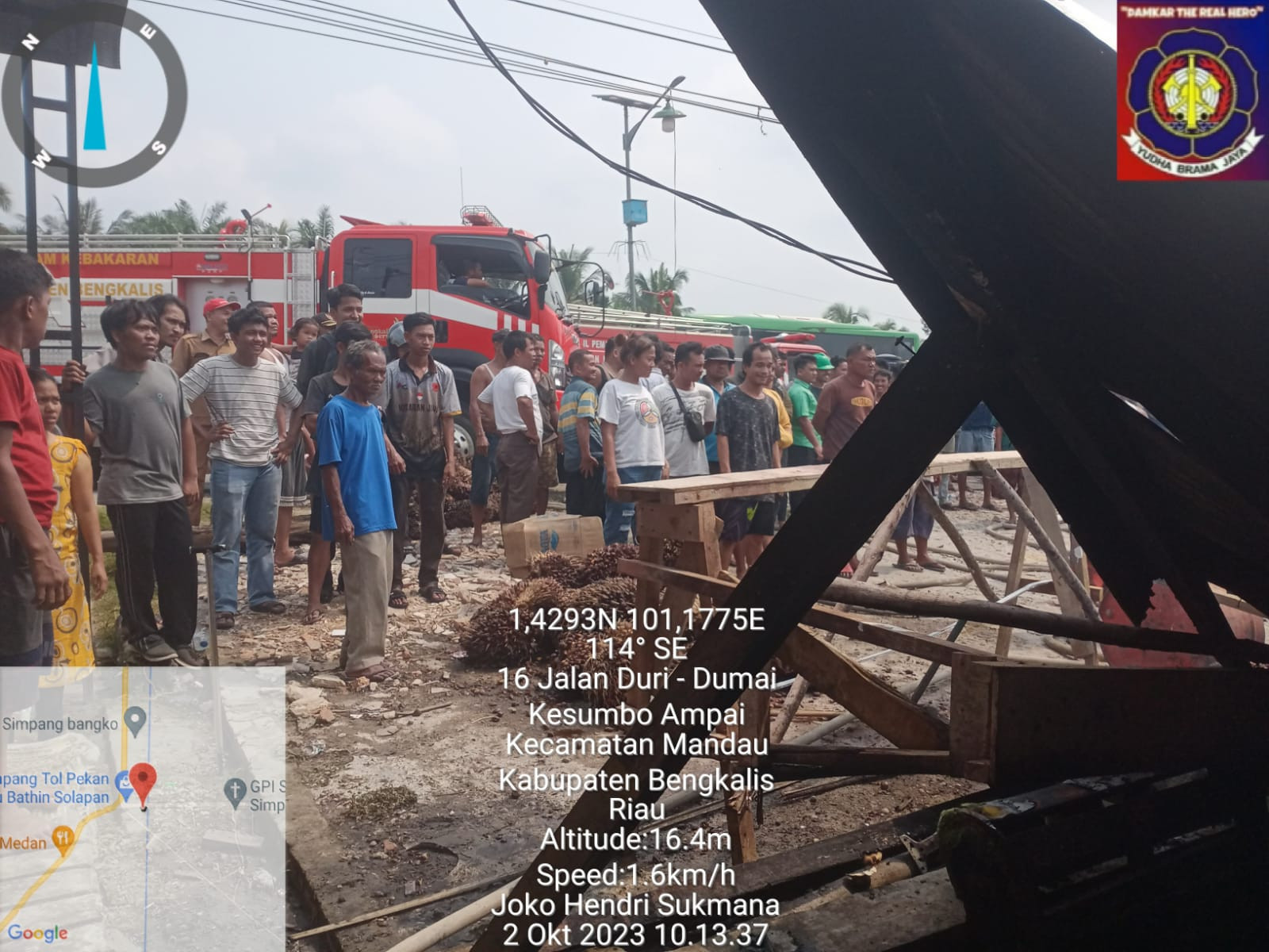 Bengkalis,Telah terjadi kebakaran rumah semi permanen (02/10/23) pukul 09.30 wib di jalan Lintas Duri Dumai km 20, Rt 02/Rw 06 Desa Bumbung Kecamatan Bathin Solapan. Penyebab kebakaran belum diketahui pasti api berhasil di padam kan pukul 10:58 wib. Tim yang turun dalam kejadian tersebut Anggota Mandau regu 01, Polisi, Pj kades Bumbung, TNI.