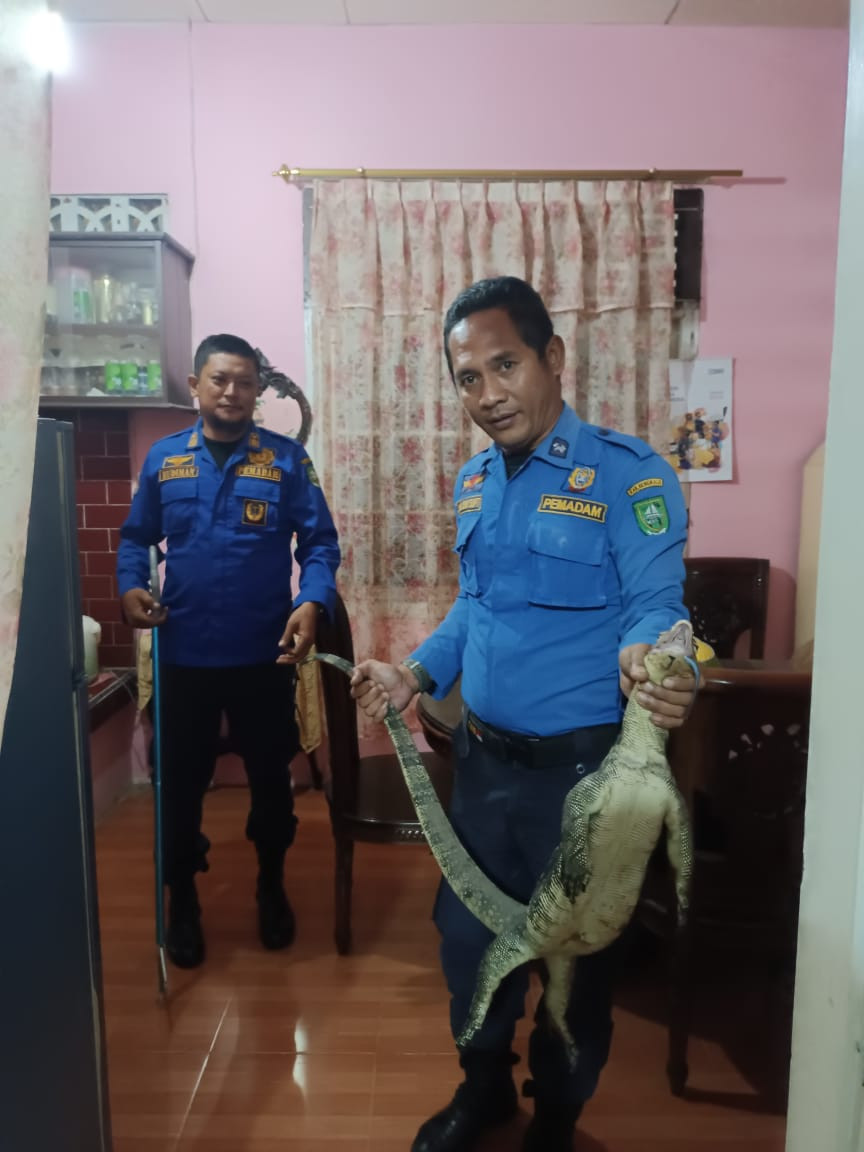MAKO DAMKAR BENGKALIS EVAKUASI BIAWAK MASUK RUMAH WARGA