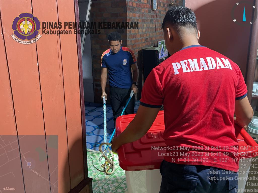 Bengkalis, Mako Damkar Bengkalis Kecamatan Bengkalis melakukan evakuasi ular King Cobra (22/05/23) pukul 21.30 Wib di Bantan Tua Kecamatan Bantan. Tim yang turun dalam kejadian tersebut Regu 01 Pos Kecamatan Bantan.