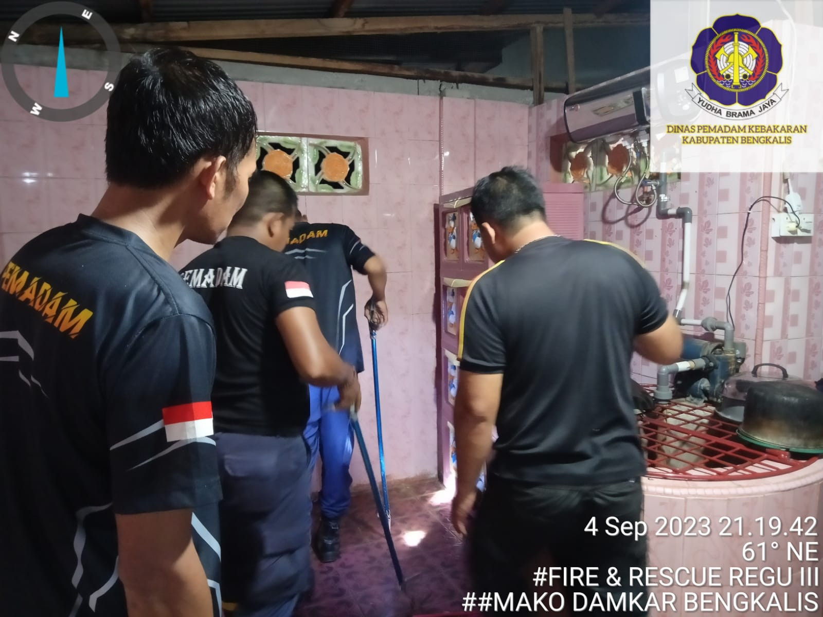 Bengkalis, Mako Damkar Bengkalis melakukan evakuasi Evakuasi ular (04/09/23) pukul 21:20 Wib di Diponegoro Desa / Kelurahan Bengkalis kota Kecamatan Bengkalis dan tiim yang turun dalam kejadian tersebut Fire & Rescue Regu 03 Bengkalis.