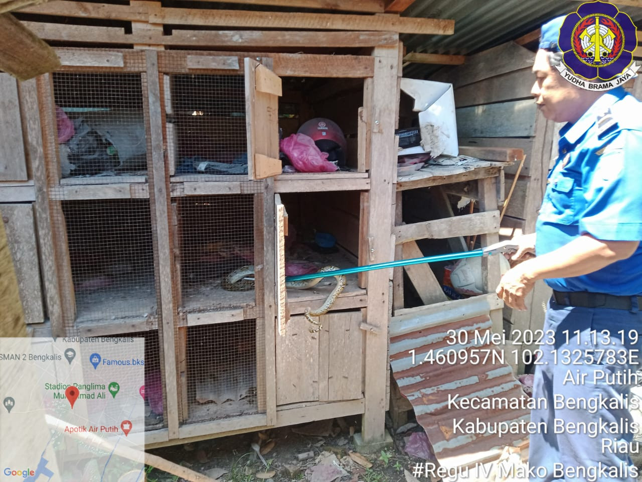 Bengkalis, Mako Damkar Bengkalis melakukan evakuasi Ular Sawa (29/05/23) di jalan Panglima Minal Gg Kamis, Desa Air Putih Kecamatan Bengkalis. Tim yang turun dalam kejadaian tersebut Fire & Rescue Regu 04 Bengkalis.