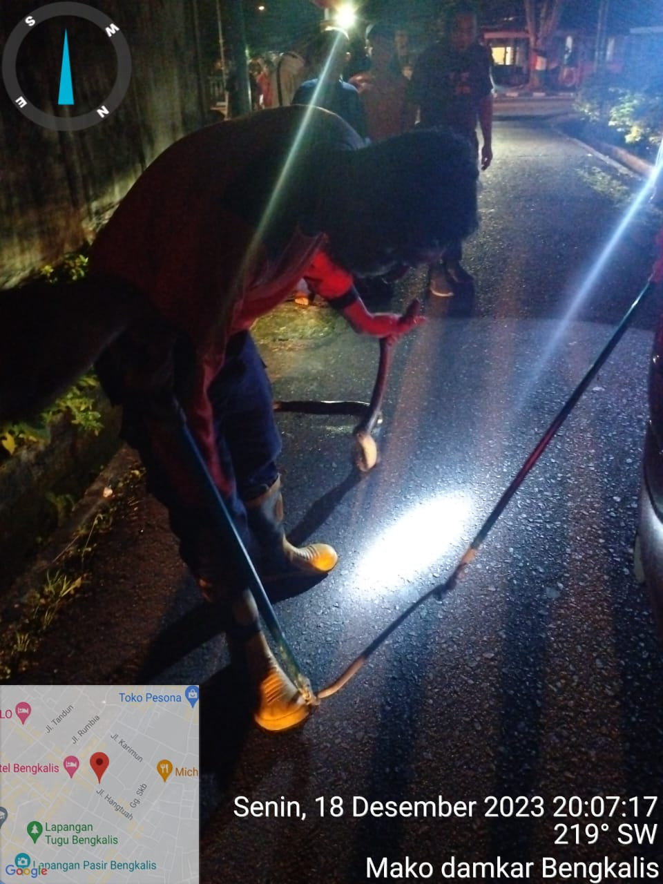 Bengkalis-Markas Komando Pemadam Kebakaran (Mako Damkar) di jalan Jendral Ahmad Yani Kelurahan Bengkalis Kota Kecamatan Bengkalis pada Minggu (18/12/23) melakukan evakuasi Ular Sawa di jalan Cemara Desa/Kelurahan Kota Bengkalis, Tim yang turun dalam kejadian tersebut Fire & Rescue Regu 02 Bengkalis.