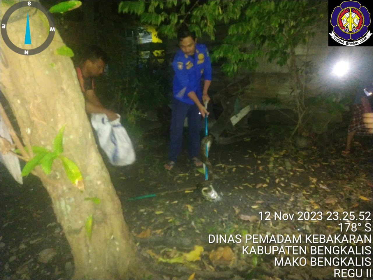 Bengkalis (12/11/2023) Mako Damkar Bengkalis Kecamatan Bengkalis mengevakuasi ular sawa di jalan Cemara Desa/Kelurahan Bengkalis Kecamatan Bengkalis. Tim yang turun dalam kejadian tersebut Fire & Rescue Regu 02 Bengkalis.