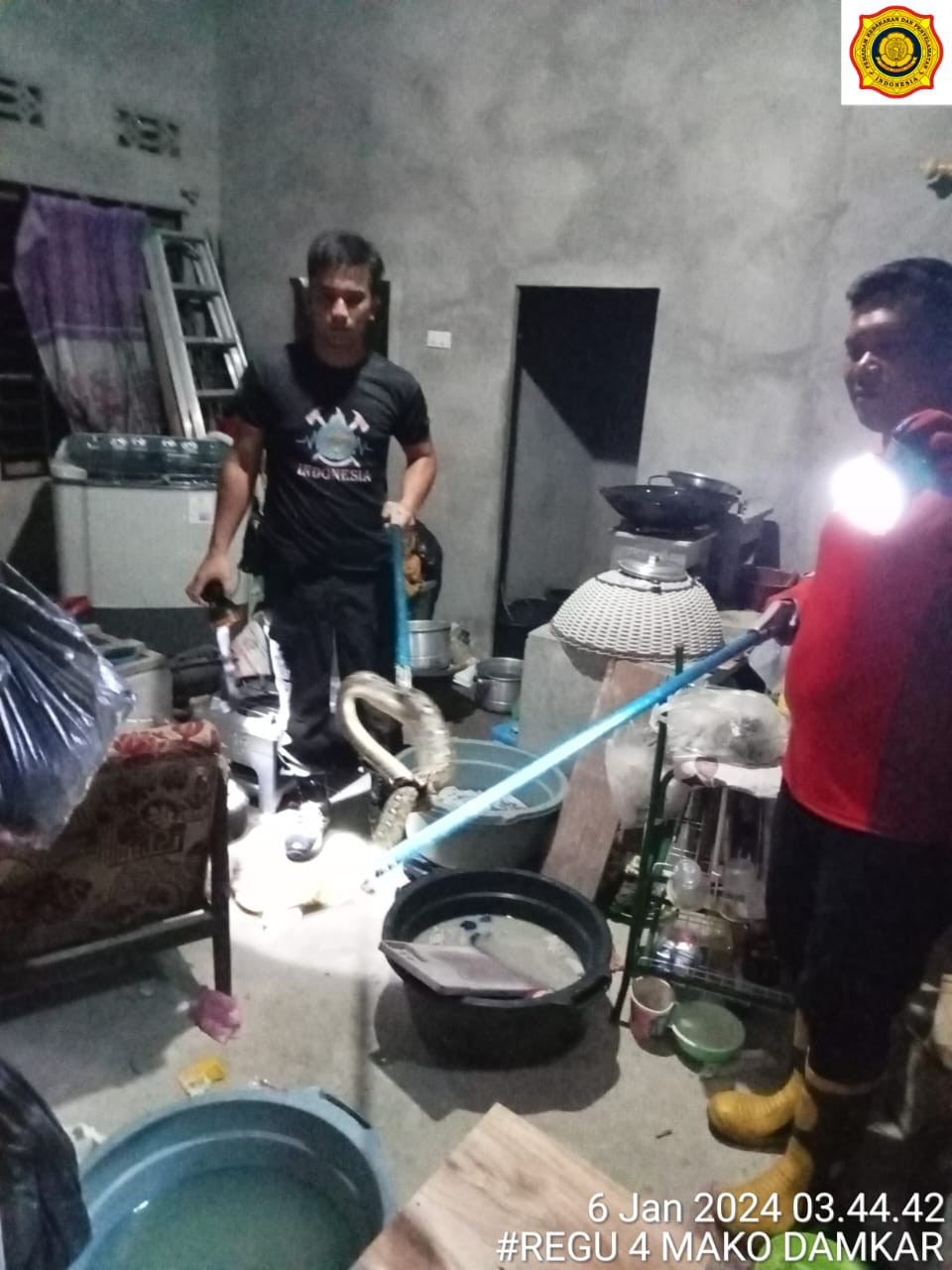 Bengkalis - Fire & Rescue Regu 04 Bengkalis mendapat laporan adanya Ular Sawa Masuk Rumah Warga (Surtii) yang beralamat di jalan Panglima Minal Gg Iklhas Desa Air Putih Kecamatan Bengkalis (6/1/24). Unit yang digunakan dalam melakukan evakuasi yaitu Mobil Fire Jeep, Stick Ular dan Box.