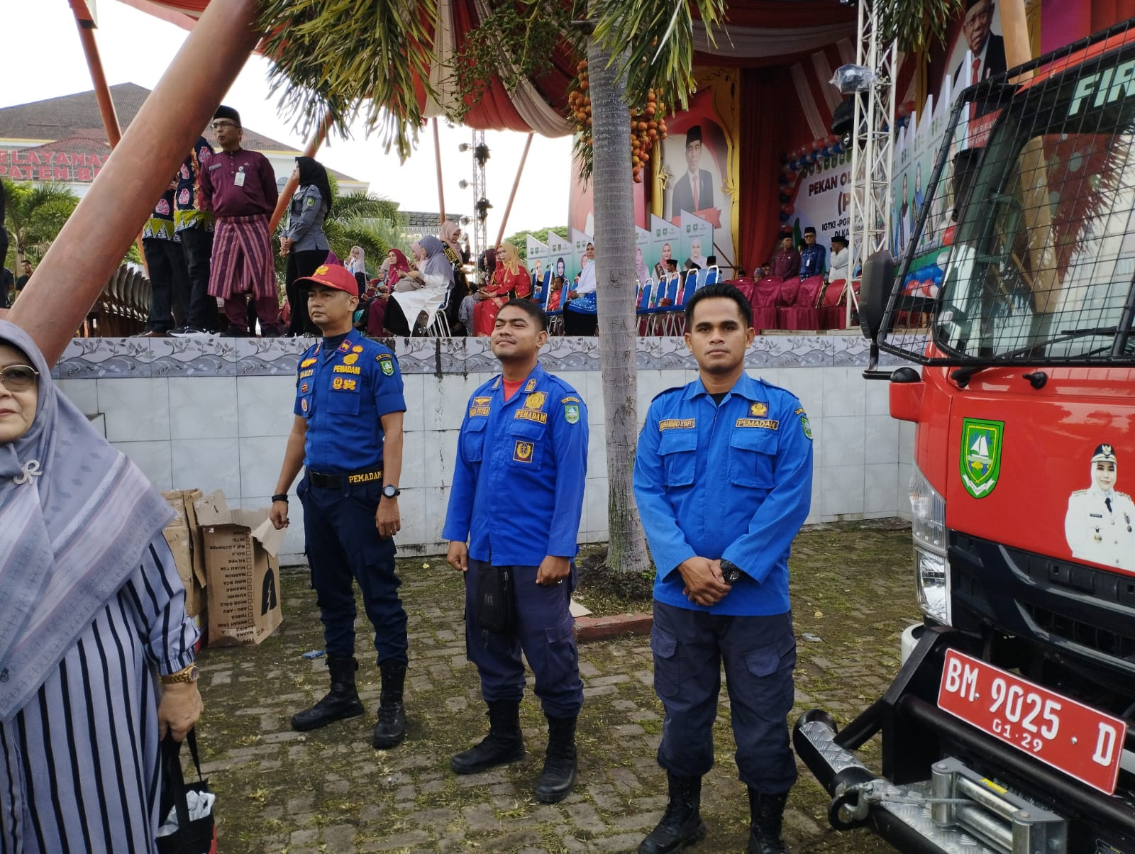 Bengkalis - Petugas Dinas Pemadam Kebakaran Mako Damkar Bengkalis melaksanakan Pengamanan (PAM) Pembukaan PORSENI IGTKI - PGRI Tingkat Propinsi Riau di Kabupaten Bengkalis yang beralamat di lapangan tugu, Selasa (28/5/24).