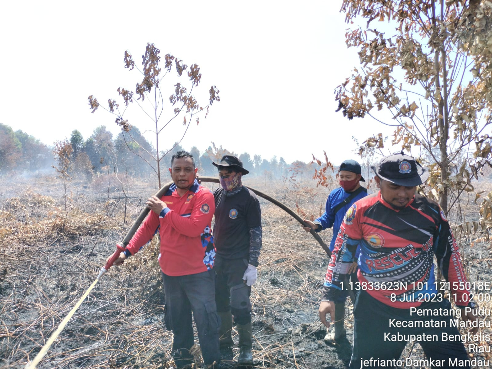 Bengkalis, Upt Damkar Mandau Melanjutkan pendinginan karlahut di tegar perbatasan desa buluh apo (08/07/23) di Tegar Kelurahan Pematang Pudu Berbatasan dgn buluh apo. Tim yang turun dalam kejadian tersebut Danru jefrianto, Ketua regu 01 yudi, Anggota regu 01.
