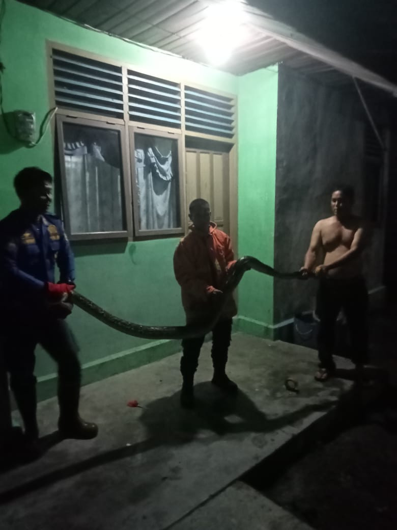 Bengkalis, (21/08/23) Pos Damkar kecamatan Bantan evakuasi ular sawa di jalan Sukarno Hatta pukul 02:00 Wib, tim yang turun dalam kejadian tersebut Kapos Muji ketua regu 2 Walyondri.