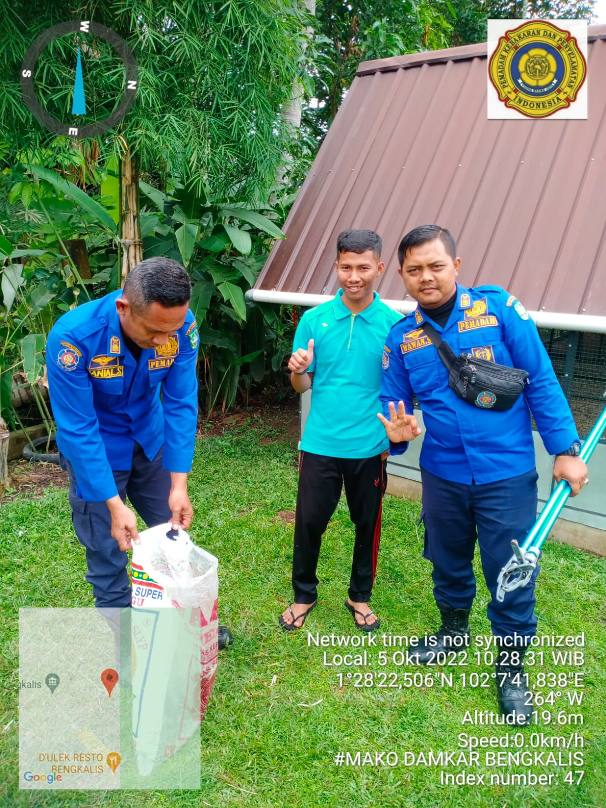 Senin (05/10/2022) Pukul 10.20-10:35 Wib, Pos Damkar Bengkalis mengevakuasi seekor ular sawa di Jalan Bantan Gg cahaya desa Sengoro Kecamatan Bengkalis. Petugas Damkar yang telah menerima laporan langsung melakukan evakuasi. Ketua regu Heri susanto dan tim yang turun dalam kejadian tersebut Fire & Rescue Regu 01 Bengkalis.