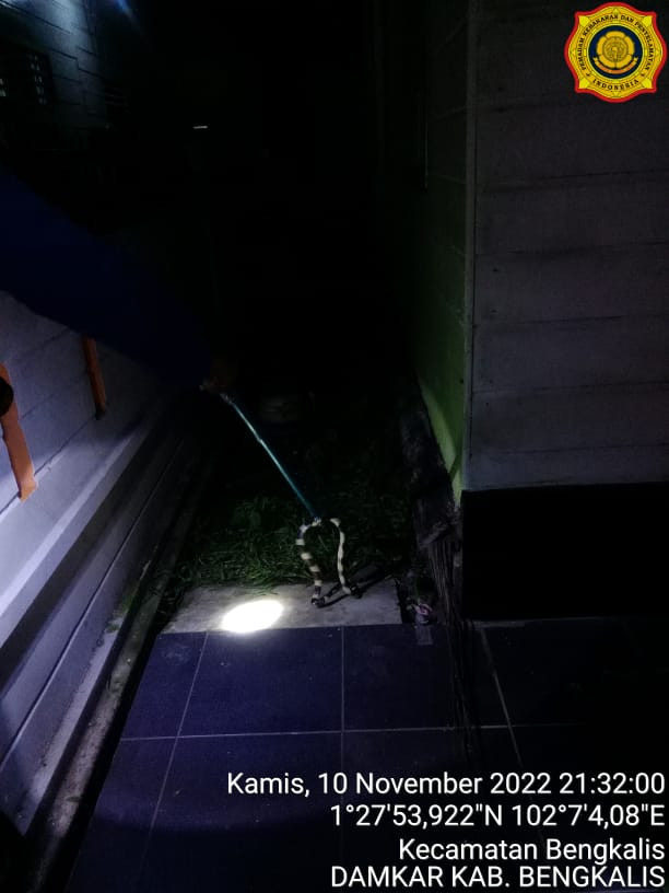 Bengkalis, Kamis 10 November 2022 Pukul 21.30 Wib s/d 21.50 Wib. Pos Damkar Bengkalis telah mengevakuasi seekor Ular Tebu di perkarangan rumah warga yang beralamat di Kebun Kapas 1, Kelurahan Rimbasekampung, Kecamatan Bengkalis Kabupaten Bengkalis. Petugas Damkar yang telah menerima laporan langsung melakukan evakuasi, tim yang turun dalam kejadian tersebut Fire & Rescue Regu 04 Bengkalis, yang diketuai oleh Andi.
