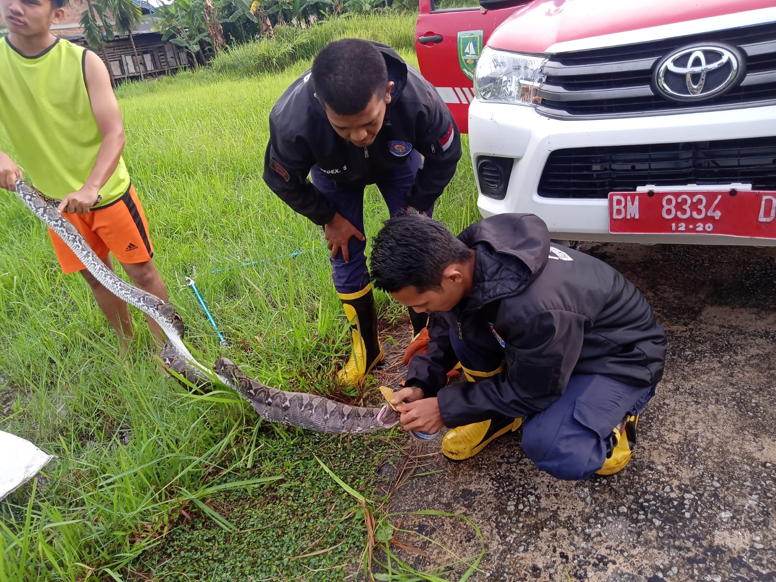 Kamis (07/04/2022) 06.30 Wib, Pos Damkar Bengkalis mengevakuasi seekor ular sawa di Jalan Antara Gg. Famili, Desa Wonosari Kecamatan Bengkalis Kabupaten Bengkalis. Petugas Damkar yang telah menerima laporan langsung melakukan evakuasi, tim yang turun dalam kejadian Fire & Rescue Regu 03 Bengkalis, Kapos bengkalis Zulkarnaen, Danru Suryadi dan Ketua Regu Fitri Agus.