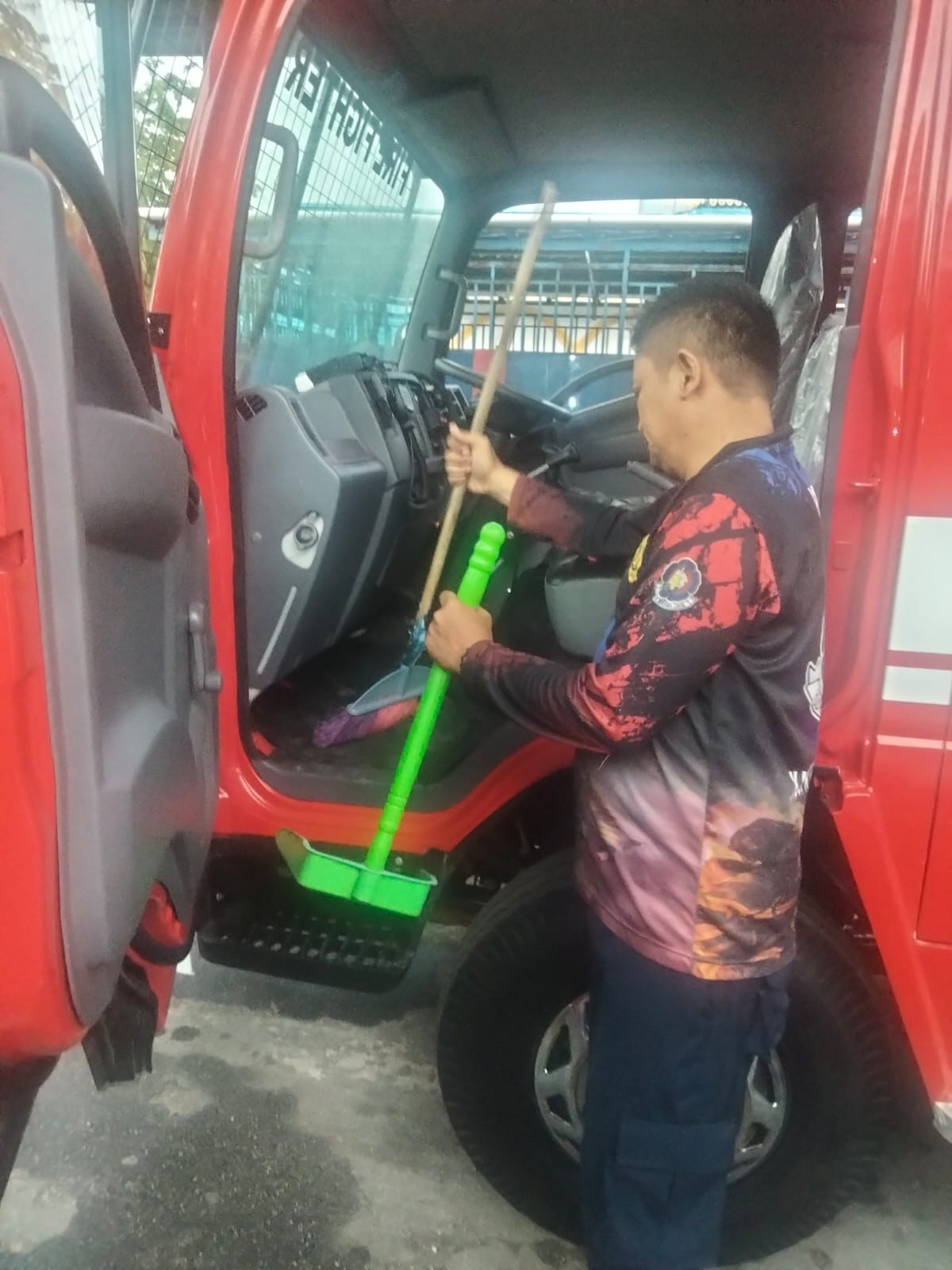 Bengkalis - Giat Petugas Mako Damkar Bengkalis Regu 1 Heri susanto melakukan pemeliharaan alat - alat armada,dan pembersihan lingkungan Damkar, Kamis (16/5/24).