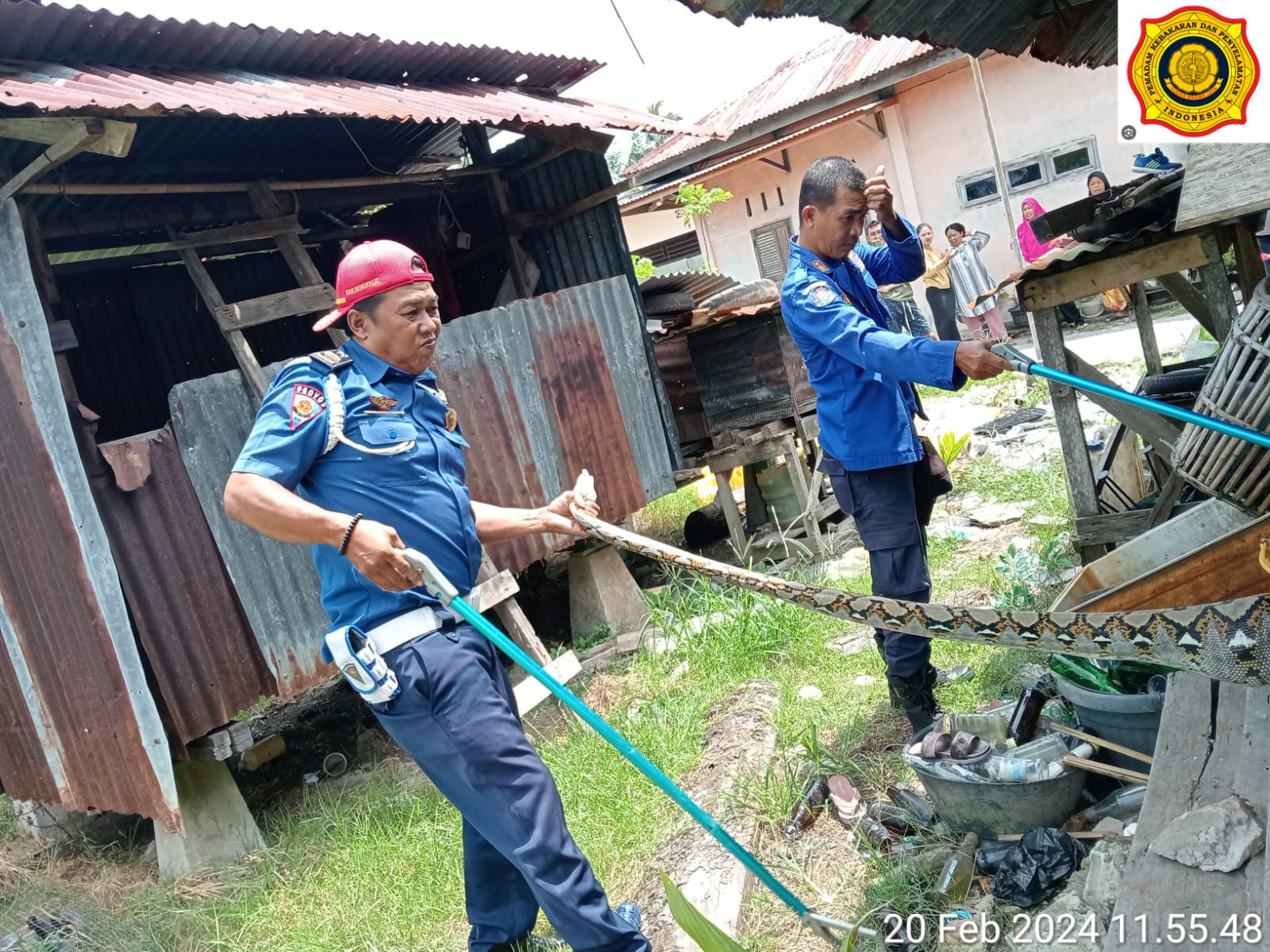 Bengkalis - Giat petugas Dinas Pemadam Kebakaran (Damkar) mengevakuasi seekor ular sawa yang berada di perkarangan warga beralamat di jalan Kelapapati tengah (Pelapor Hawa) Kelurahan Desa Kelapapati Kecamatan Bengkalis, Selasa (20/2/24).