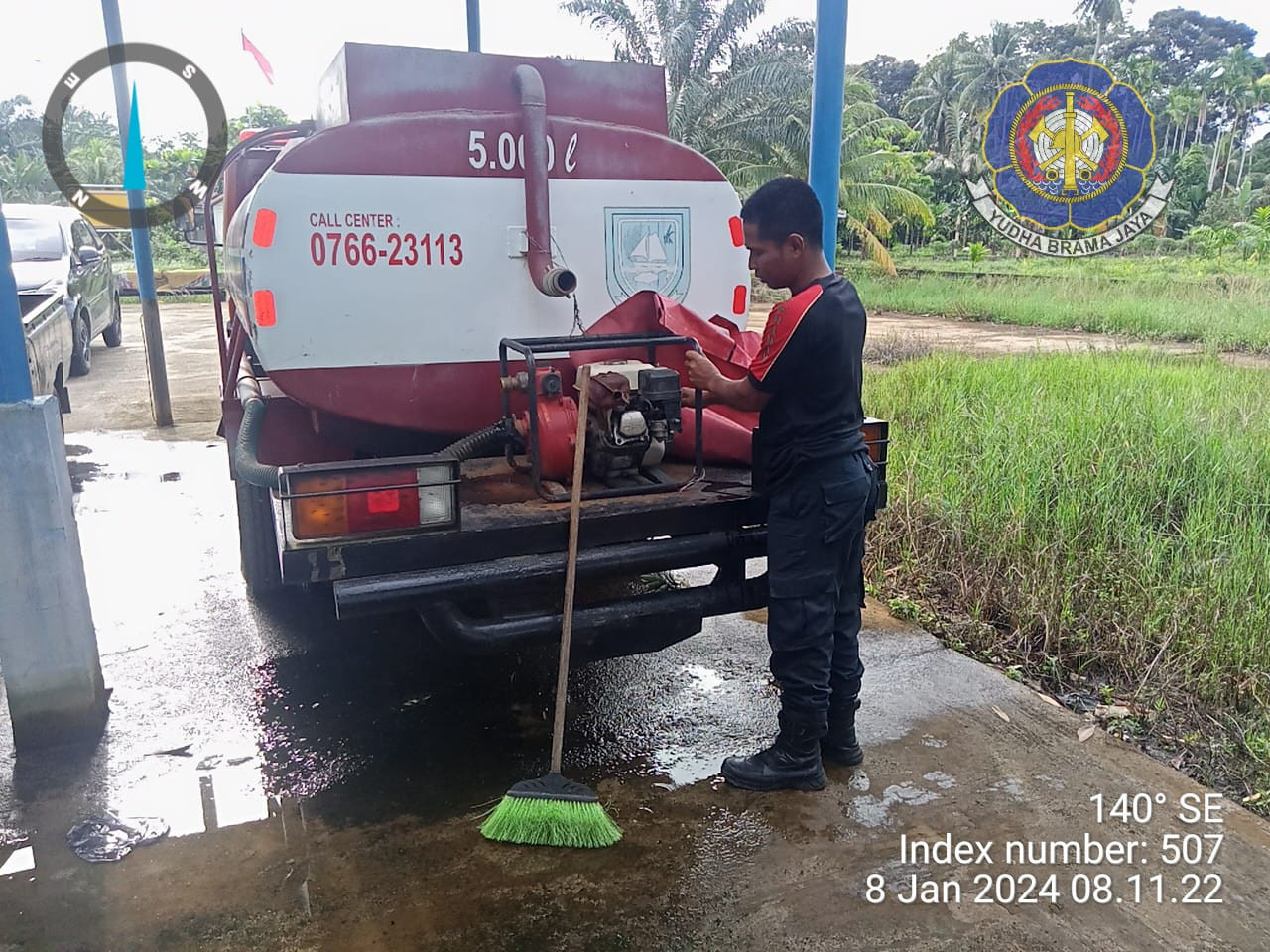 Bengkalis - Pos Damkar Kecamtan Bantan Regu 01 Kabupaten Brengkalis melakukan pemeliharaan alat armada pemadam kebakaran serta pembersihan lingkungan Pos Damkar Kecamatan Bantan (8/1/24) Komandan Regu 01 Sunardi.