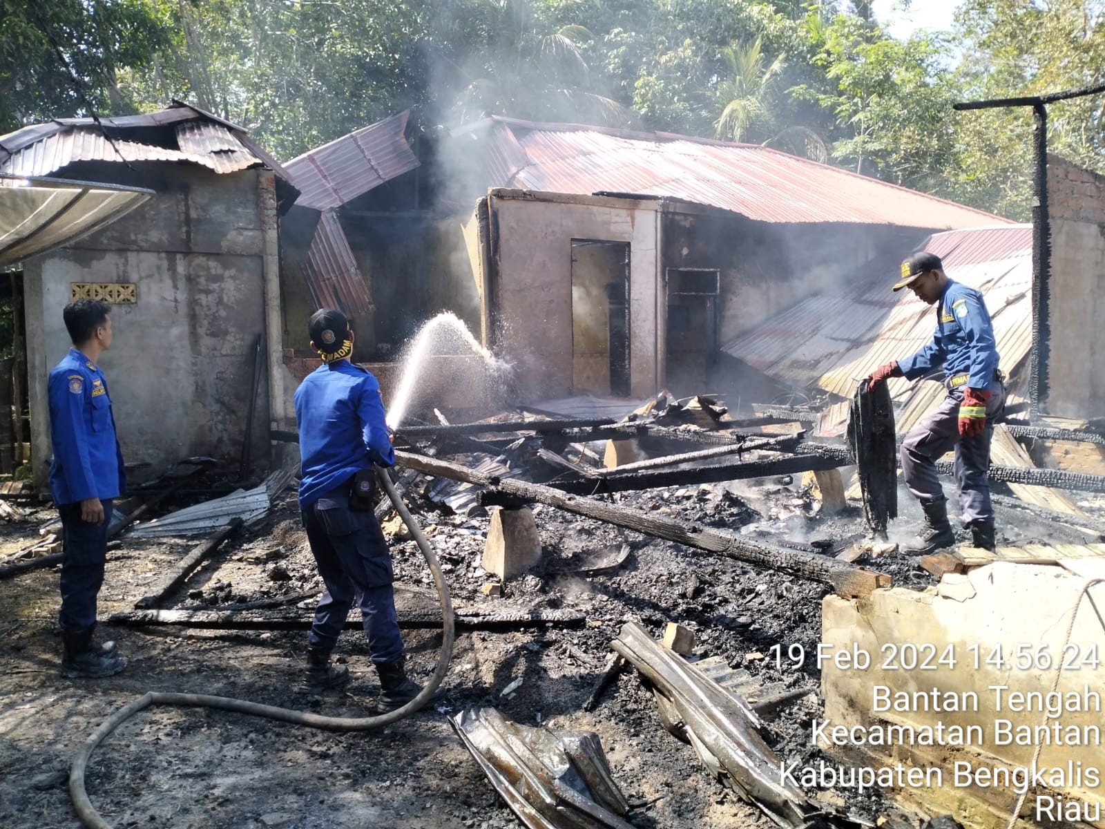 Bengkalis - Tim Pemadam kebakaran (Damkar) Kabupaten Bengkalis gerak cepat dalam padamkan api yang membakar rumah warga di jalan Dr Sutomo (Pelapor Winarto) Pemilik rumah Samingan Desa Bantan tengah Kecamatan Bantan Kabupaten Bengkalis, (19/2/24) Senin.