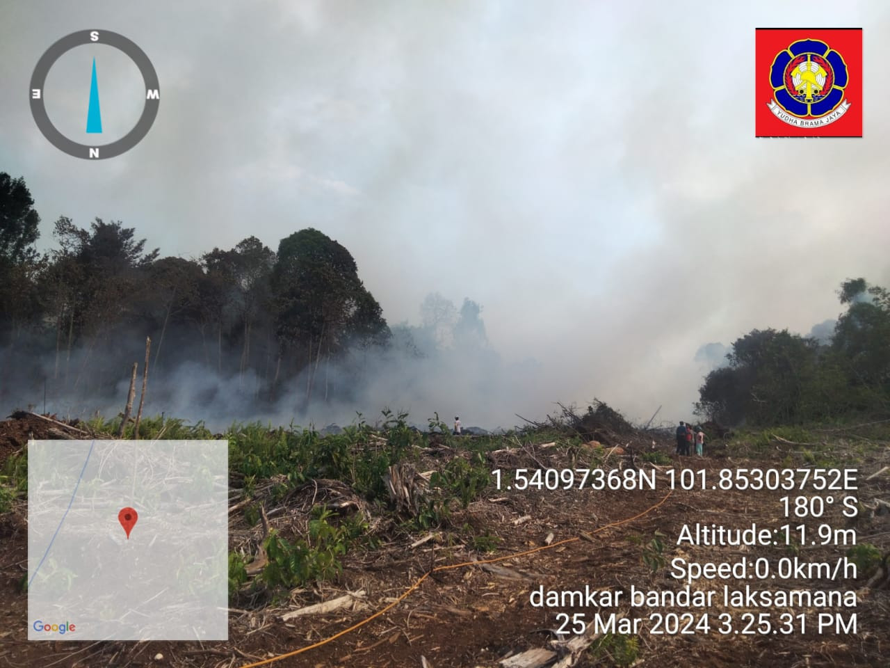 NB: Petugas Damkar Pos Bandar Laksamana yang turun lapangan lokasi kebakaran dengan jarak tempuh 35 menit dipimpin oleh Kepala Pos Indra Dermawan didampingi Ketua Regu Syafrizal Ahbari dengan jenis peralatan antara lain 1 unit Robin, 3 roll slang 1 setengah, dan 2 buah Nozzel.