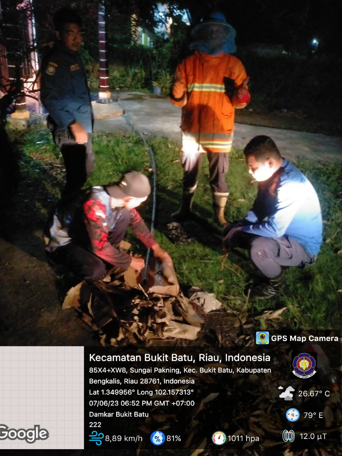 Bengkalis, UPT Damkar Kecamatan Bukit Batu melakukan evakuasi tawon (07/06/23) pukul 19.10 Wib di jalan Sukajadi, Desa Pakning Asal, Kecamatan Bukit Batu. Tim yang turun dalam kejadian tersebut Fire & Rescue Regu 02 Bukit Batu.