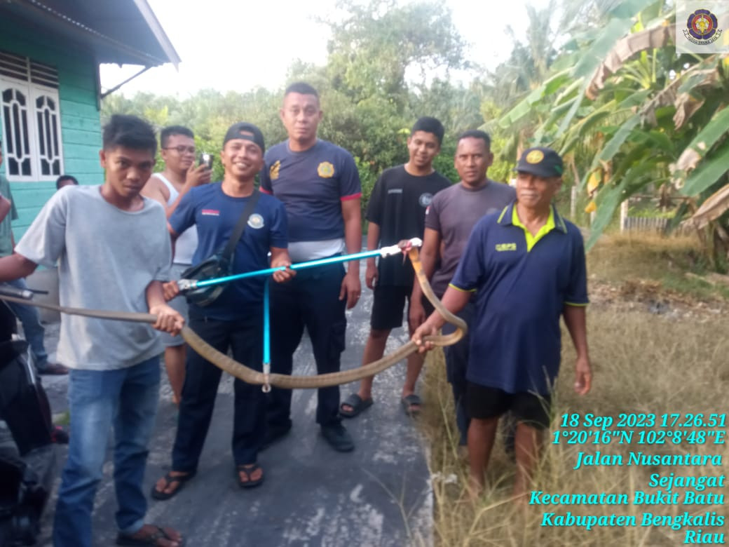 Bengkalis, (18/09/23) UPT Damkar Kecamatan Bukit Batu evakuasi ular kobra di jalan Nusantara Gg Budi Mulia Rt 002/Rw 005 Dusun Pakning Kecamatan Bukit Batu. Tim yang turun dalam kejadian tersebut Regu 1 bukit batu.