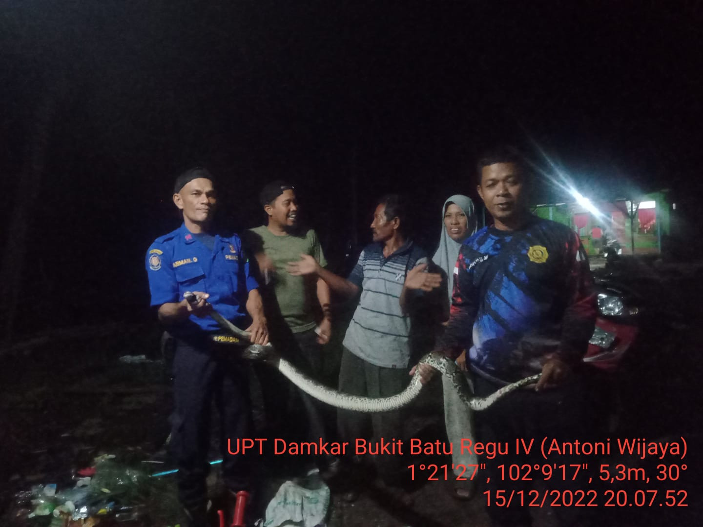 Bengkalis, Kamis 15 Desemeber 2022-UPT Damkar Kecamatan Bukit Batu telah mengevakuasi ular sawa dikandang ternak warga (15/12/2022) dijalan Bambu Kuning Dusun Sungai Timun Kelurahan Sungai Pakning Kecamatan Bukit Batu Kabupaten Bengkalis Petugas Damkar yang telah menerima laporan langsung melakukan evakuasi Ketua Regu IV Antoni Wijaya.