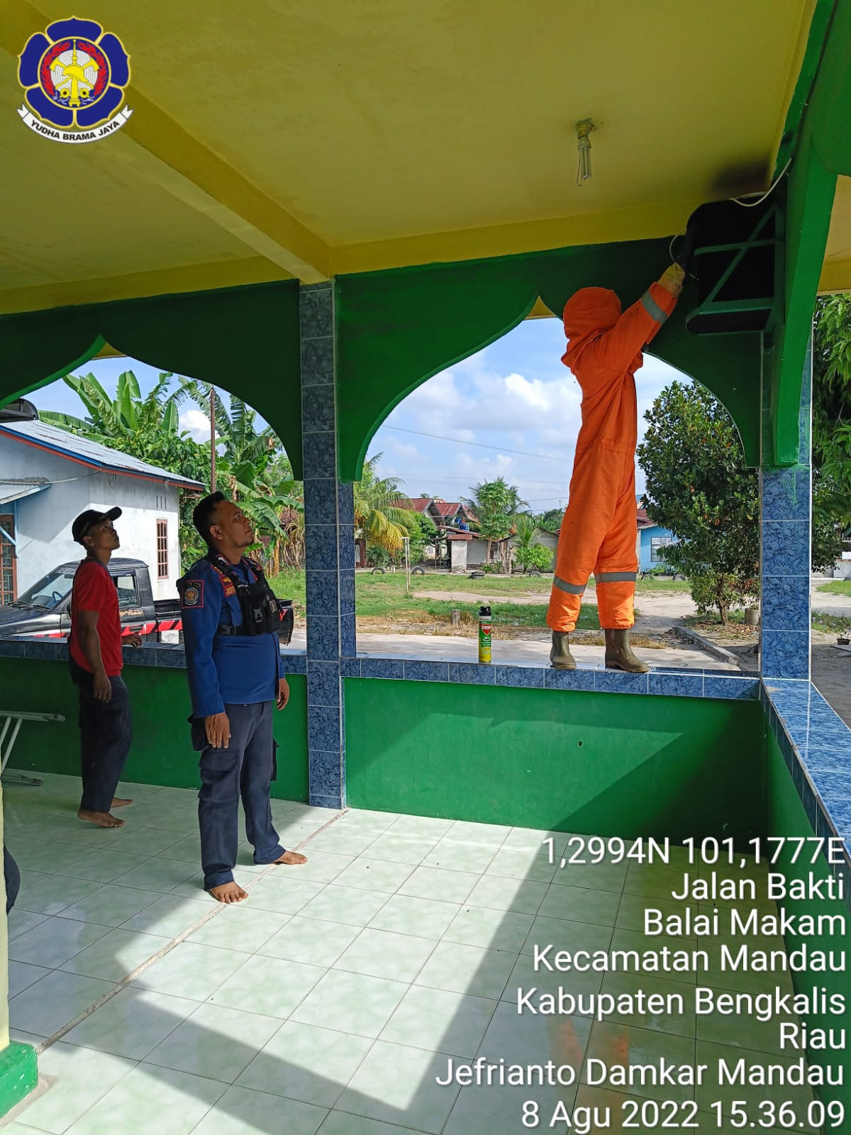 Senin (08/08/2022) Pukul 15:25 Wib, UPT Damkar Kecamatan Mandau telah melakukan evakuasi lebah di Masjid 'ibadul manan di Jalan Bakti Rt 02/Rw 02 Desa Simpang padang Kecamatan Bathin solapan. Petugas Damkar yang telah menerima laporan langsung melakukan evakuasi tim yang turun dalam kejadian tersebut Danru jefrianto Anggota regu 02.
