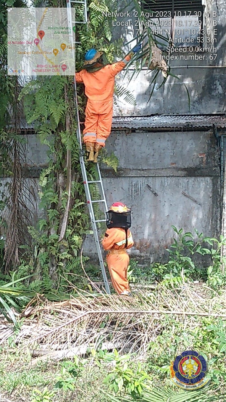 Bengkalis, Upt Damkar Kecamatan Mandau melakukan evakuasi tawon ( 02/08/23) pukul 08.45 Wib di jalan Arafah, Rt 02/Rw 05, Kelurahan air jamban, Kecamatan Mandau. Tim yang turun dalam kejadian tersebut Ketua regu 02 yudi, Anggota regu 02.