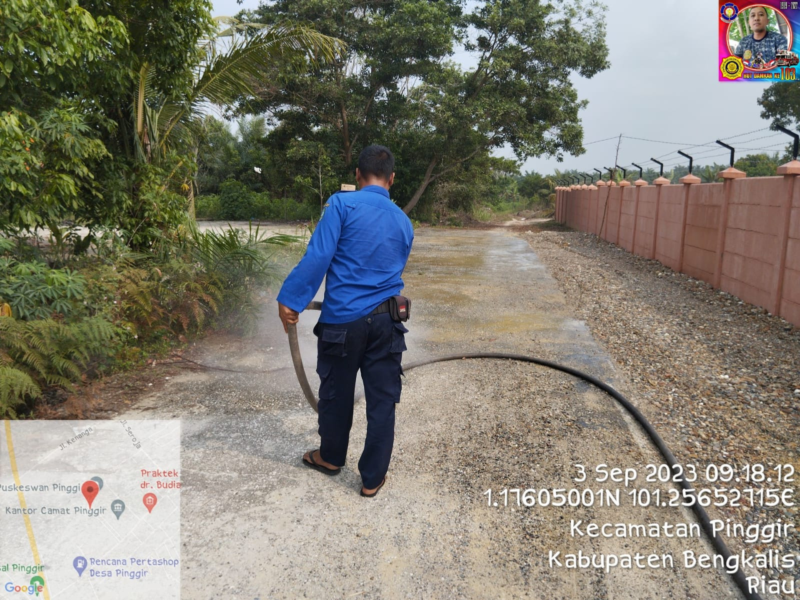 Bengkalis, (03/09/23) Upt Damkar Kecamatan Pinggir melakukan Penyiraman jalan menuju parkir arena MTQ Kabupaten Bengkalis dan tim yang turun dalam kejadian tersebut Ketua Regu 02 : Abd. Rahman.