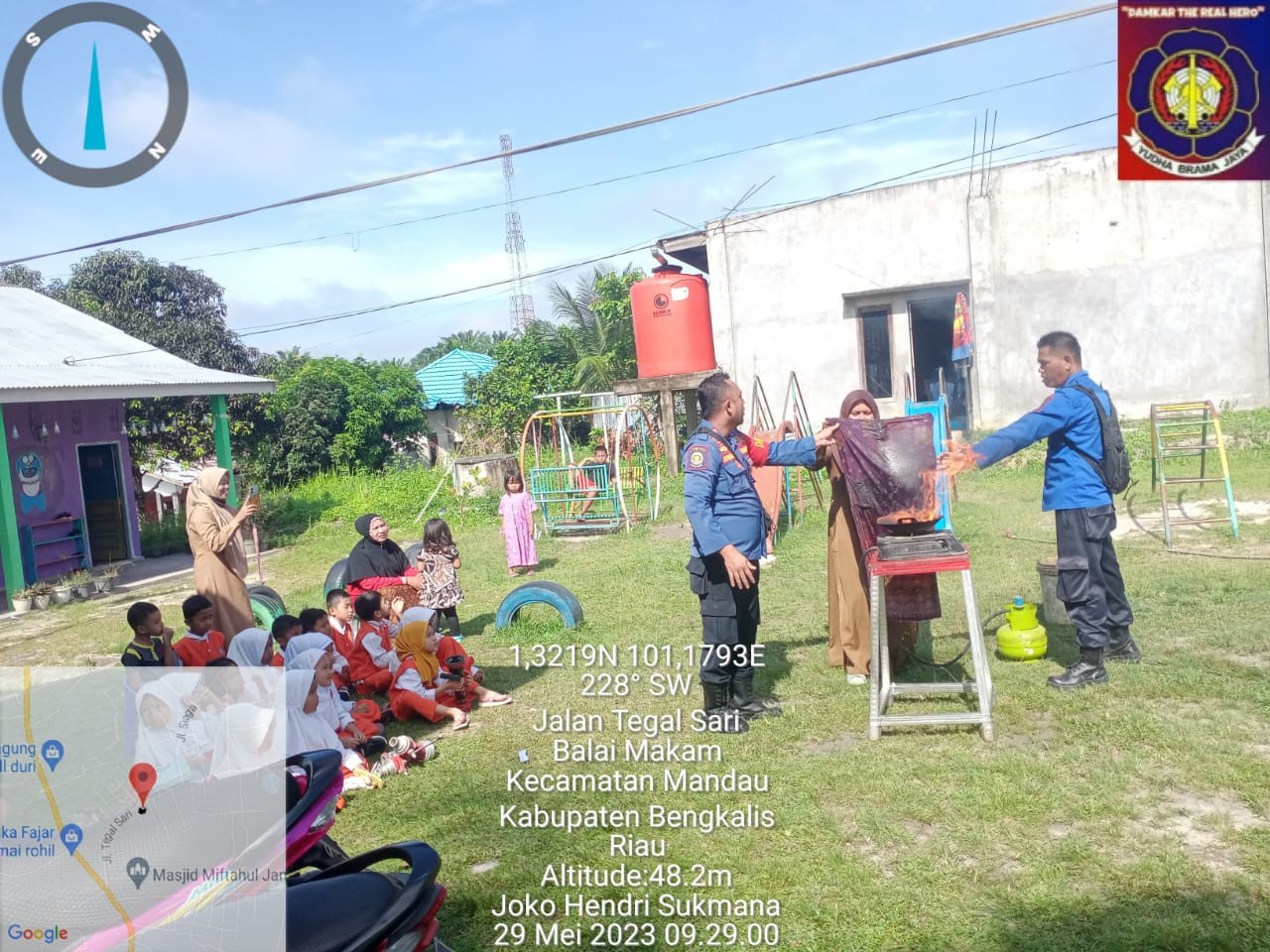 Begkalis, UPT Damkar Mandau melakukan simulasi di TK Nurul Sadira (29/05/23) Acara dimulai dari pengenalan profesi damkar oleh petugas damkar, Materi yang disampaikan antara lain pengenalan Alat Perlindungan Diri, peralatan dan perlengkapan yang dibawa saat bertugas. Tim yang turun dalam kejadian tersebut M. Rafi, Danru Jefrianto, Anggota regu 01.