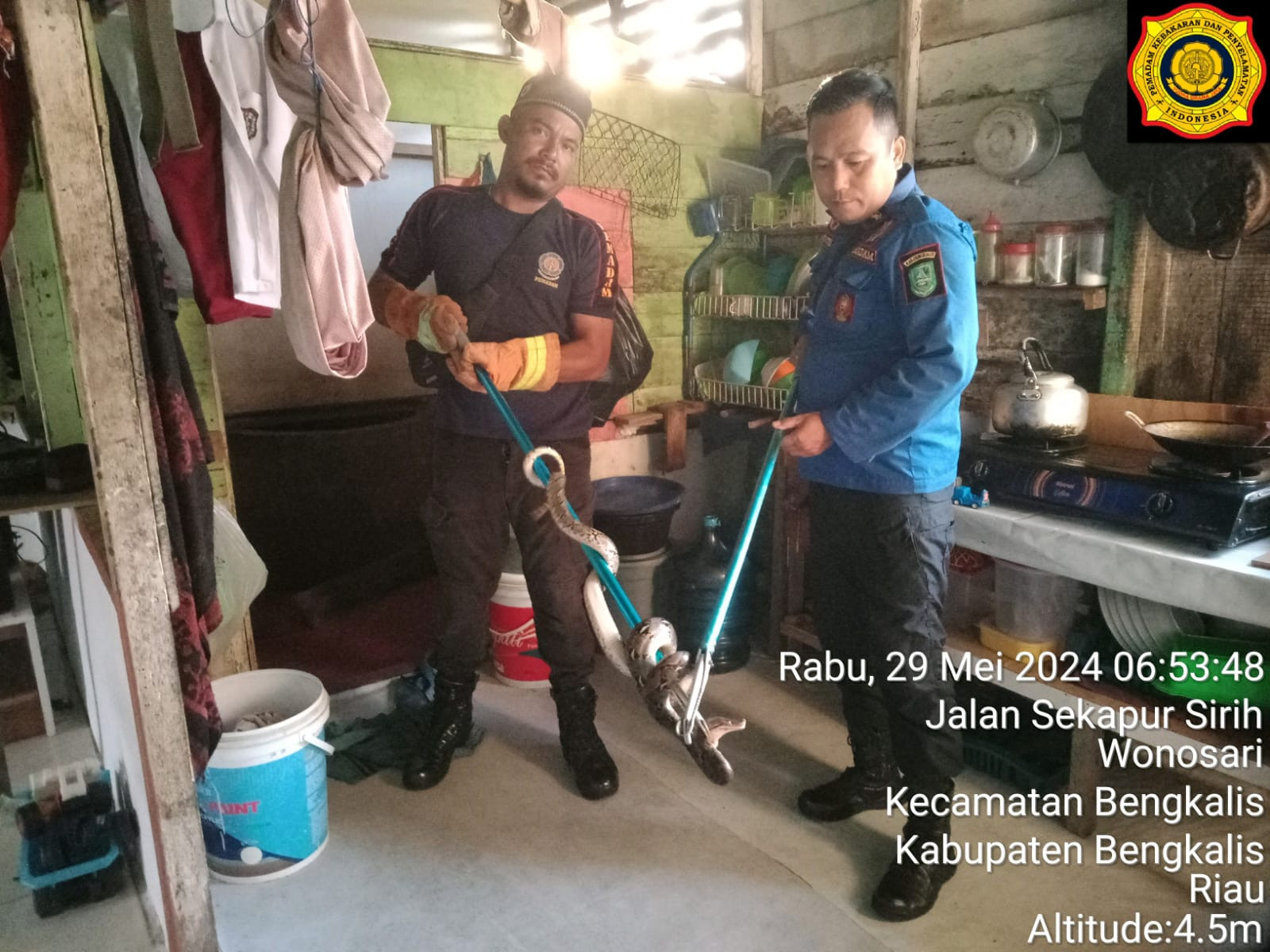 Bengkalis - MAKO Damkar Bengkalis menerima laporan dari warga (Yanti) ada ular sawa yang masuk perkarangan warga, tim yang menerima laporan langsung bergerak cepat menuju ketempat lokasi kejadian yang beralamat di jalan HS Soebrantas Gg Sikapur Sirih Desa Wonosari Kecamatan Bengkalis, Rabu (29/5/24). Petugas Mako Damkar Bengkalis yang turun dalam kejadian tersebut Fire & Rescue Regu 04 Bengkalis.